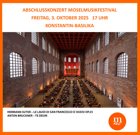 Der Schlussakkord der Jubiläumssaison des Moselmusikfestivals steht ganz im Zeichen der Lobpreisungen: Anton Bruckners „Te Deum“, ein Hymnus für Chor, Solisten, Orchester und Orgel, zählt zu den populärsten Werken seines Schaffens und wurde von Bruckner selbst als sein „Stolz des Lebens“ bezeichnet. Ergänzt wird das Programm durch Hermann Suters selten aufgeführtes Oratorium „Le Laudi di San Francesco d’Assisi“, basierend auf dem Sonnengesang des Heiligen Franziskus. Ein festlicher Schlussakkord, der die spirituelle Kraft der Musik zum Thema hat.